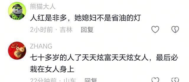 他有表示,人红是非多,主要是他媳妇的问题! 70多岁的人了,天天炫富,天天炫女人,这样不太好!